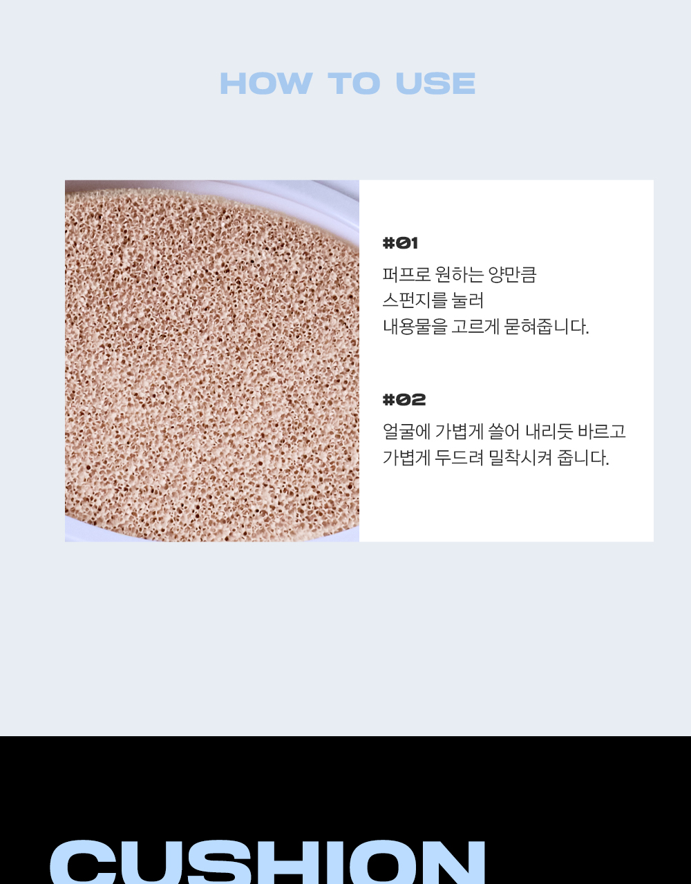 使用粉撲輕輕按壓氣墊海綿,取適量產品,然後以輕拍的方式塗抹於臉部,均勻推開。