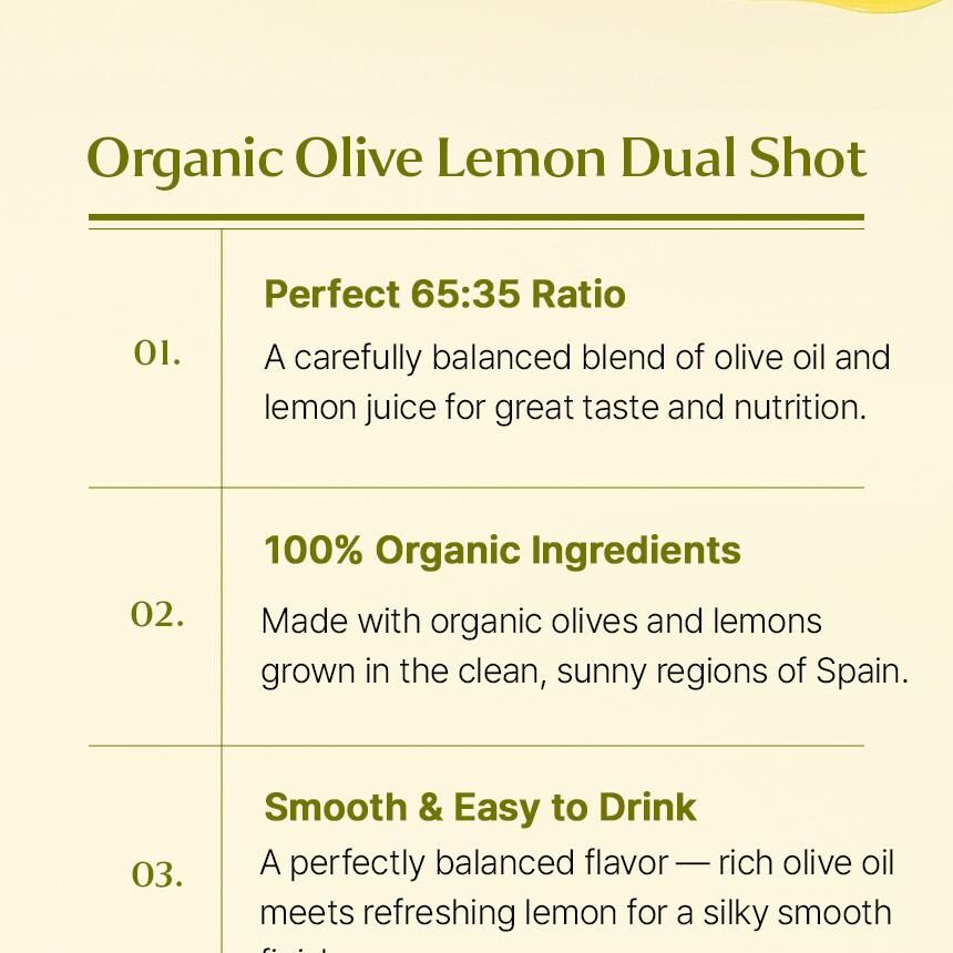 ✨ 黃金平衡配方:經過數十次配比測試,將溫潤醇厚的橄欖油與清爽酸甜的檸檬完美融合,口感滑順不油膩,徹底顛覆「喝油保養」的刻板印象。