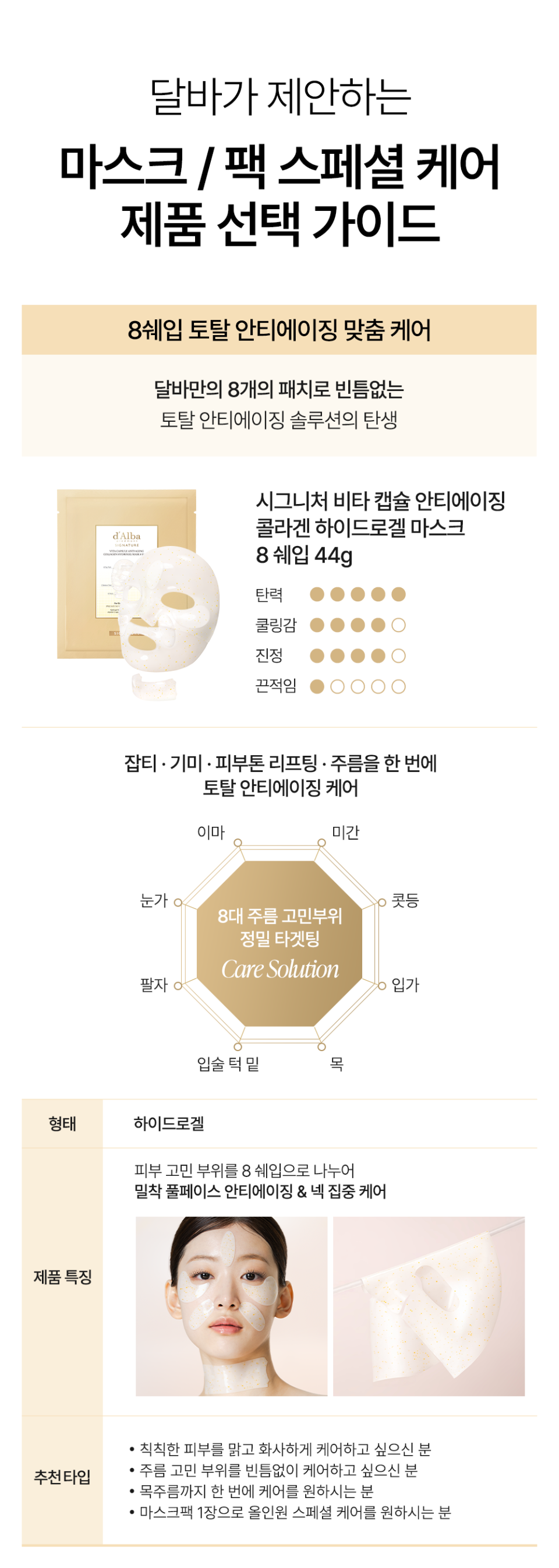 💧 立體灌注飲:內層採用「水凝膠 (Hydrogel)」高倍滲透技術,含 8 重玻尿酸與水解膠原蛋白,在強大壓力下將活性成分壓入肌底,解決細紋乾燥。