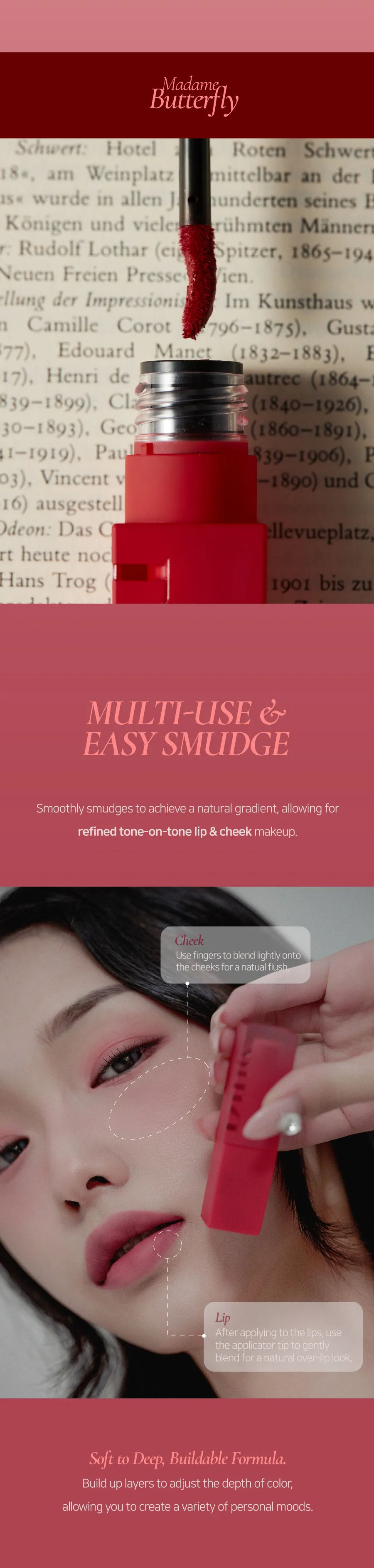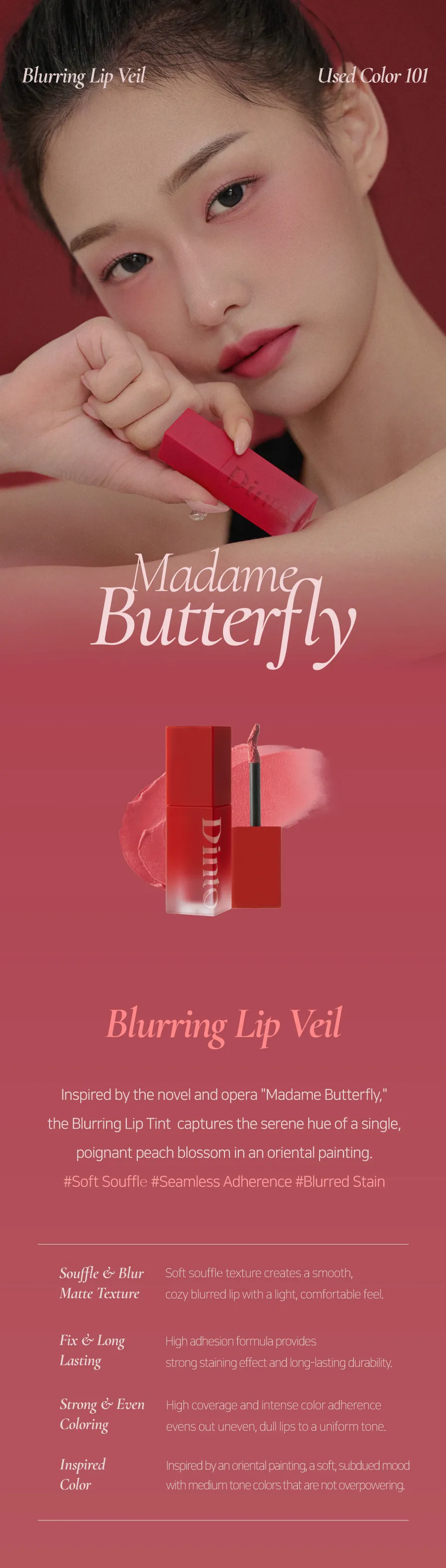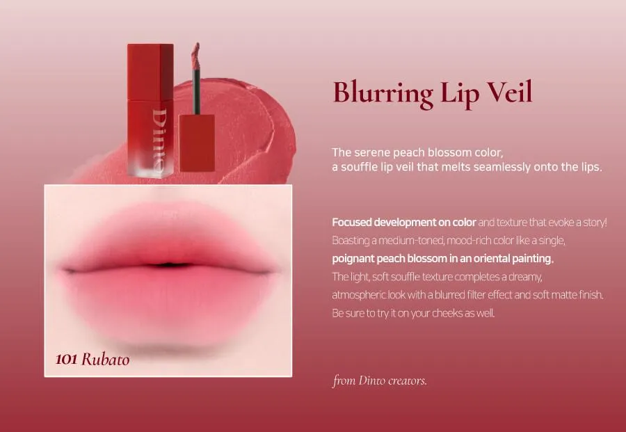 🌫️ Blurring Veil 柔焦遮瑕技術:質地如雲朵般輕盈服貼,抹開瞬間形成一層絲絨薄紗,能完美修飾唇紋與暗沈邊緣,打造柔焦霧面濾鏡感。