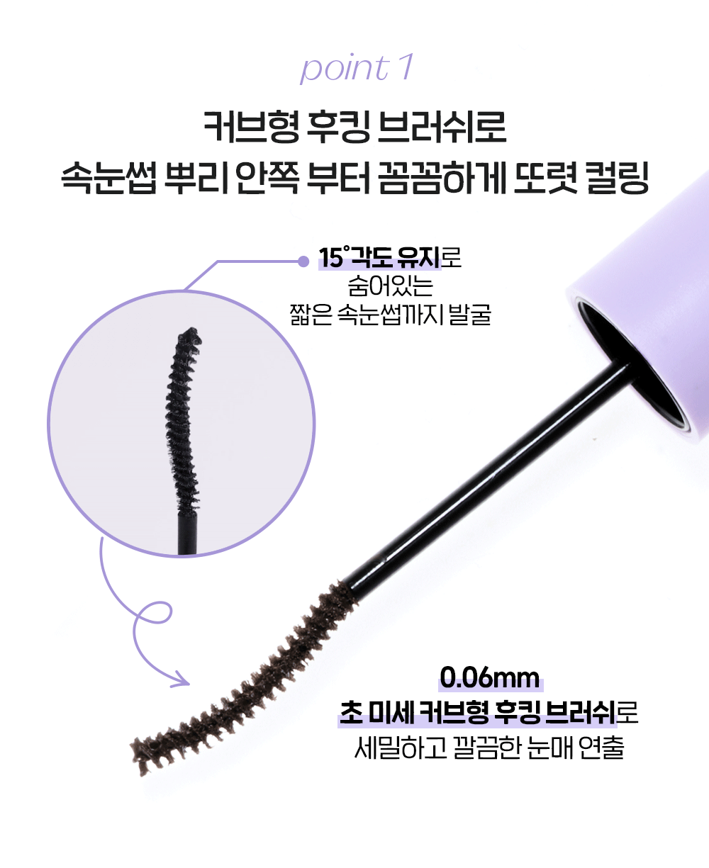 📐 極細弧形勾勒刷頭 (Skinny Hooking Brush):專為細短睫毛設計的極細刷頭,能精準捕捉眼頭、眼尾及下睫毛,從睫毛根部開始穩定抓附,打造零死角的立體捲翹。