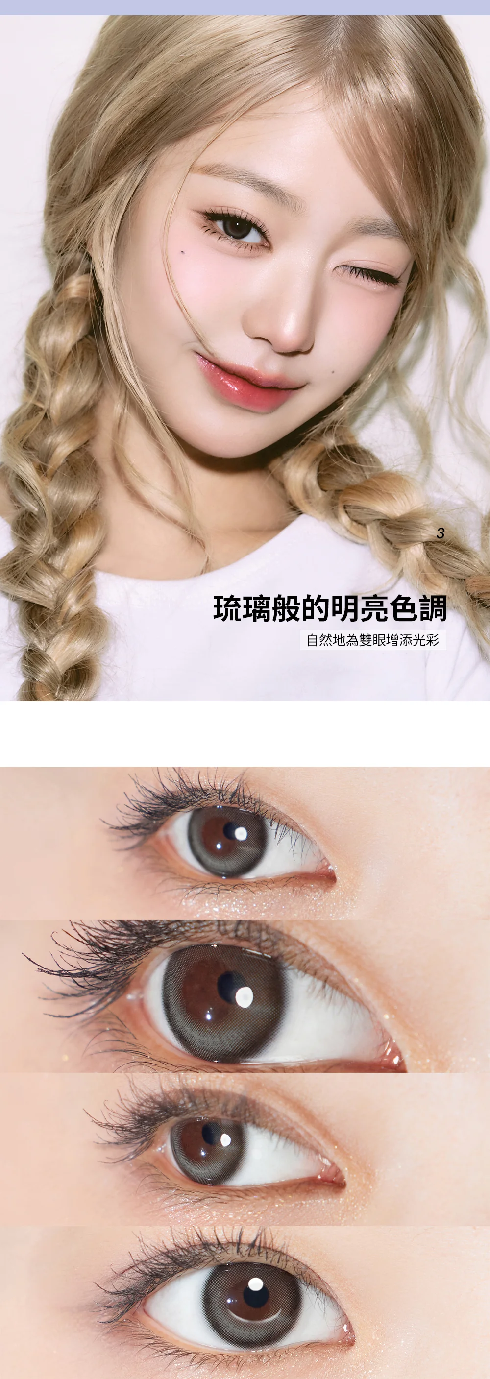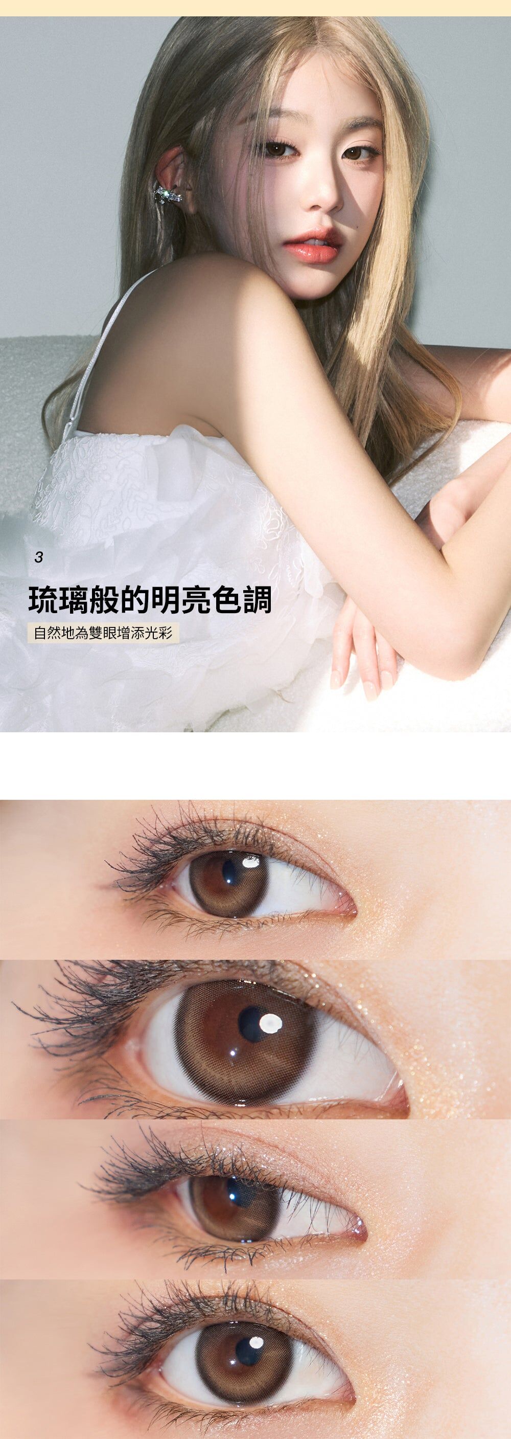 ✨ 玻璃般的通透色澤:即便著色範圍增加,色澤依將保持如同玻璃般的透明度,讓雙眼看起來清澈、乾淨且充滿神采。