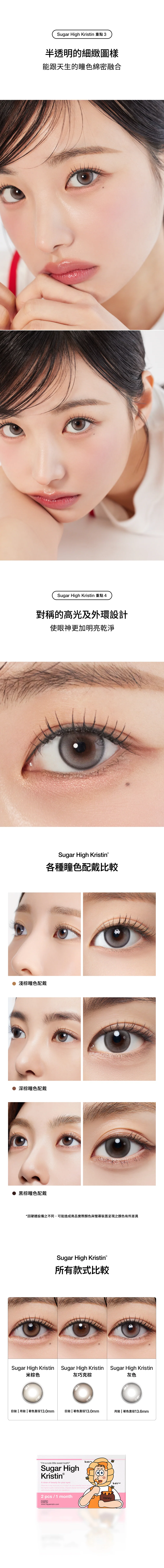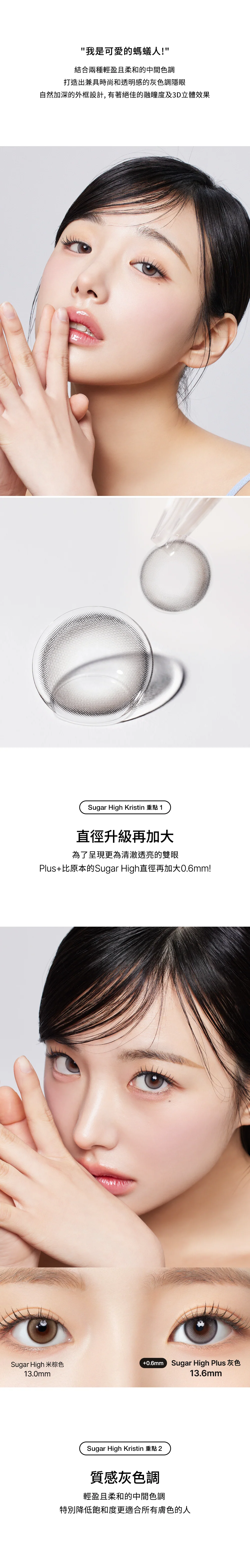 🍭 Plus 升級:甜度與氣場並存:Sugar High Kristin Plus 系列保留了經典的甜美靈魂,並將著色直徑大幅提升至 13.6mm。專為追求「極致放大感」與「深邃 3D 效果」的女孩設計,讓妳的眼神瞬間電力爆表。