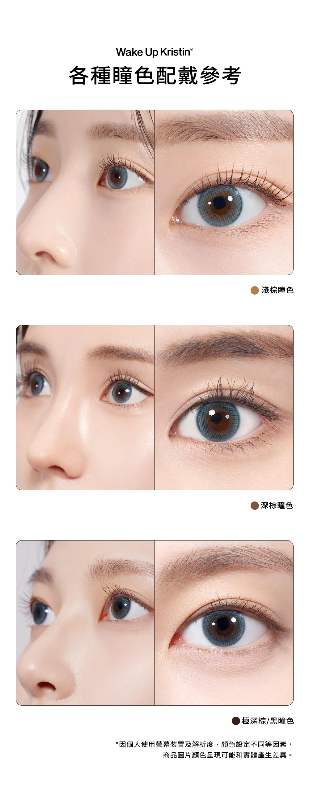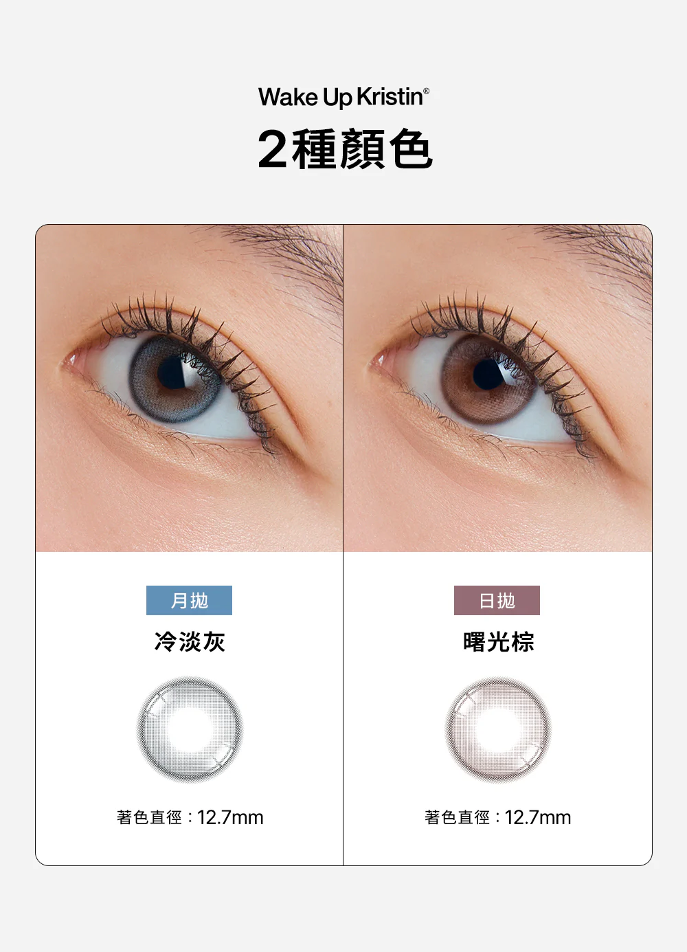 Wake Up Kristin #Pale Grey 成功捕捉了「透明感」與「顯色度」的平衡。12.7mm 的著色直徑能完美契合原生瞳孔大小,透過灰藍色的漸層,打造出如同天生混血般的冷清氣質,讓眼神煥發出如同晨曦般的清透光澤。