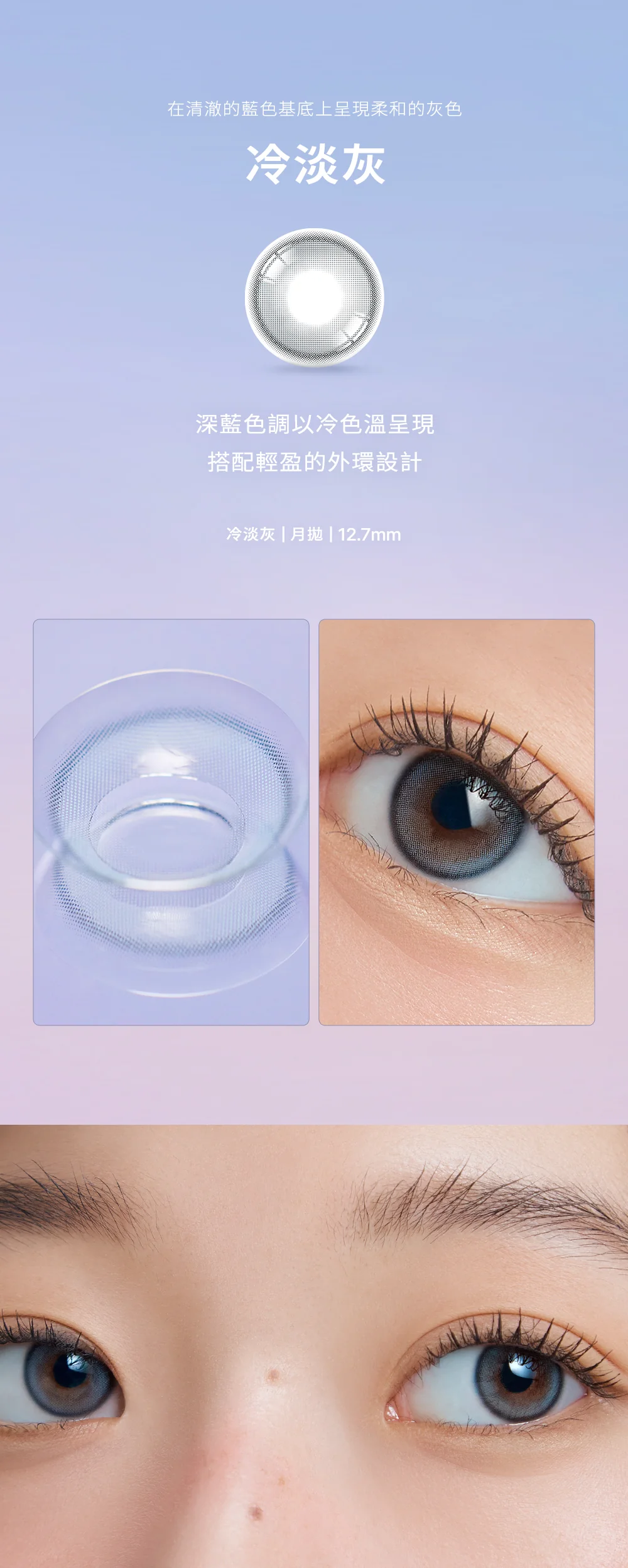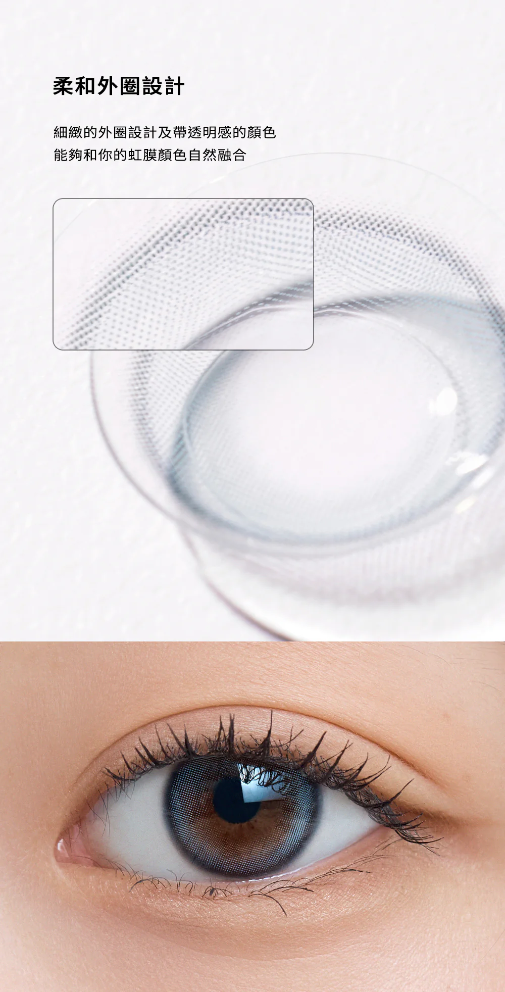 ⭕ 極細緻圓環鎖邊 (Thin Ring Edge):配備了極細的鎖邊設計,能輕柔地勾勒出眼部輪廓。在 12.7mm 的小直徑下,既能定義眼神的深邃感,又不會產生厚重的框架感。