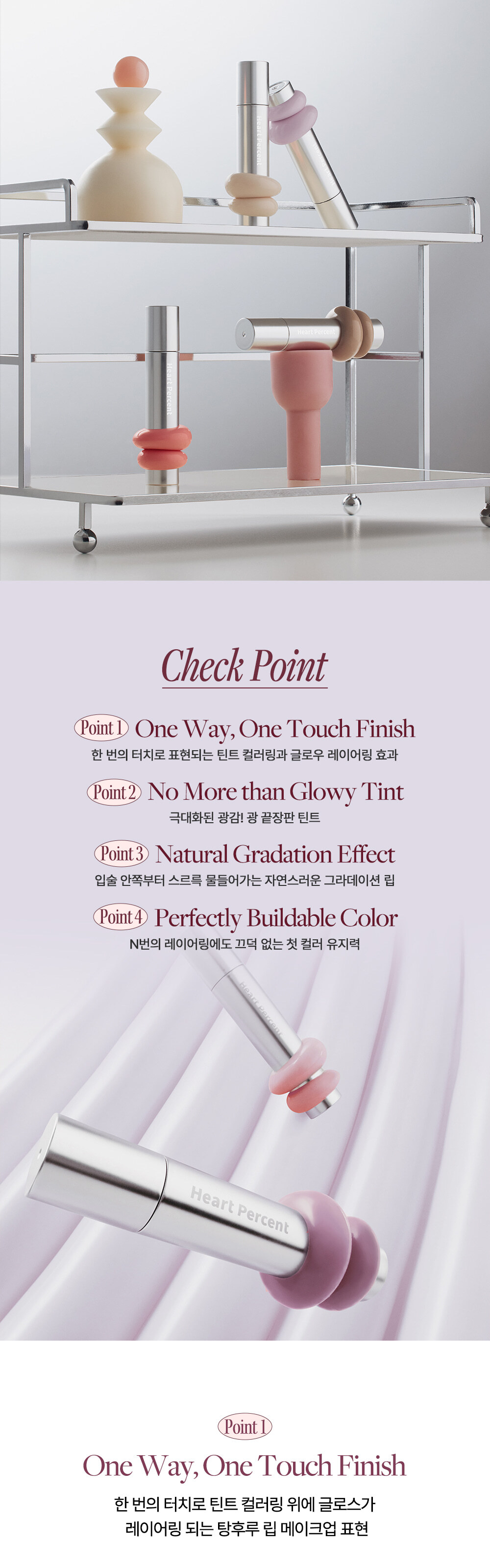 💎 極致琉璃鏡面感: 獨家「單向光澤技術 (One Way Glow)」,只需輕輕一抹,即可在雙唇表面形成如琉璃般的透亮水光層。光線折射下呈現 3D 立體飽滿感,瞬間隱形唇紋。