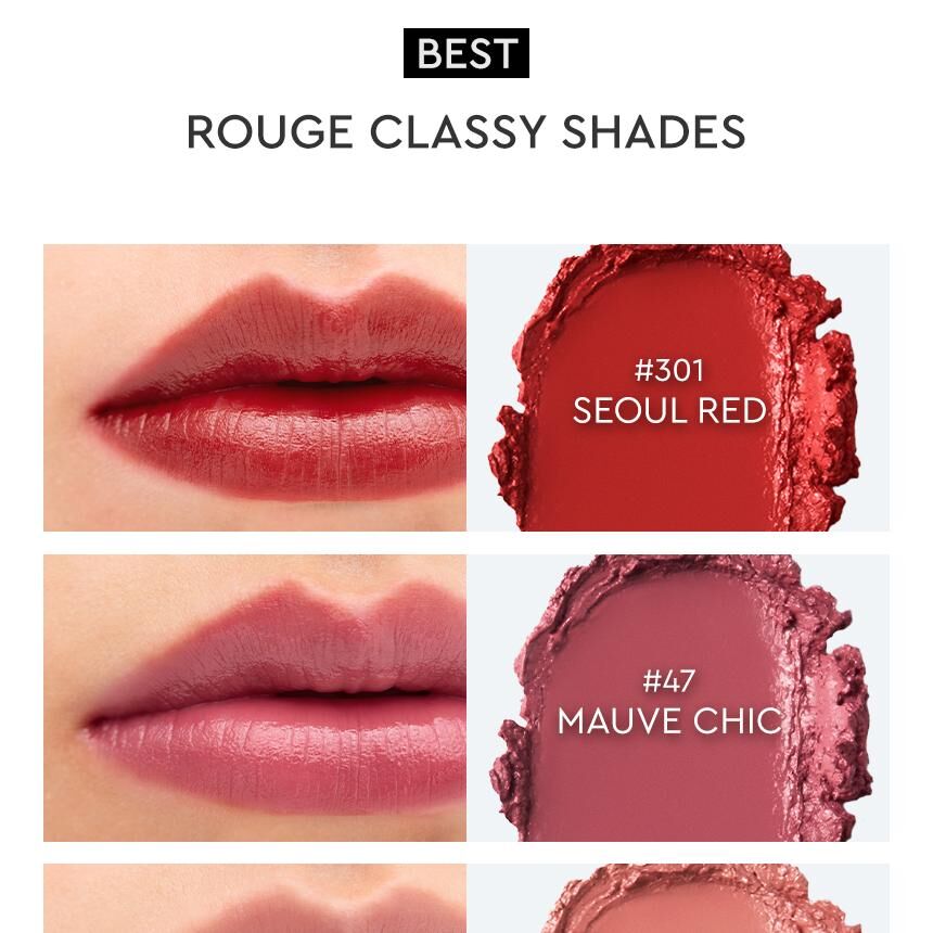 這是一款展現「首爾精緻美學」的旗艦級唇膏。HERA Rouge Classy 專注於色彩的純粹與本質,融合了低調的高級絲緞光澤(Soft Shine)。其獨特的紅黑色系包裝與奢華質地,專為追求自信、優雅且具備獨特個性(Persona)的女性設計。這不僅是一支唇膏,更是展現個人風格的時尚配件,讓雙唇在輕盈無負擔的狀態下,綻放 12 小時持久的鮮明色澤。