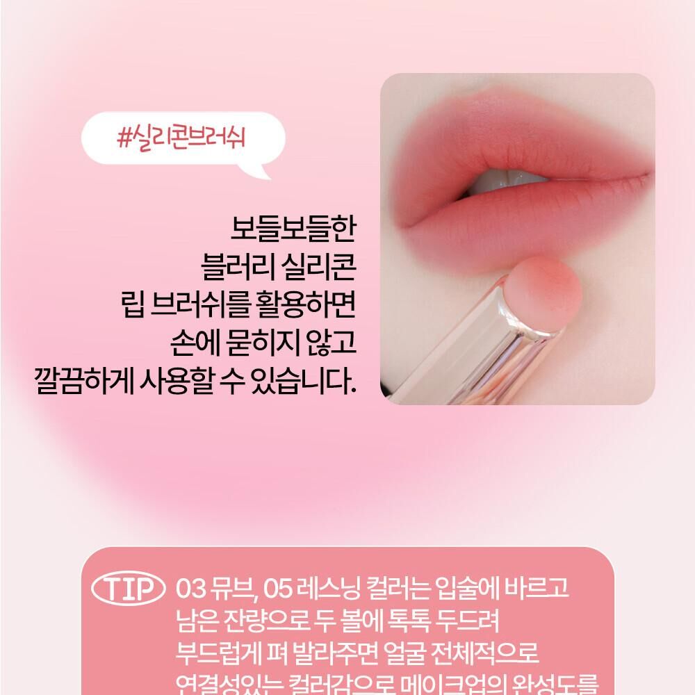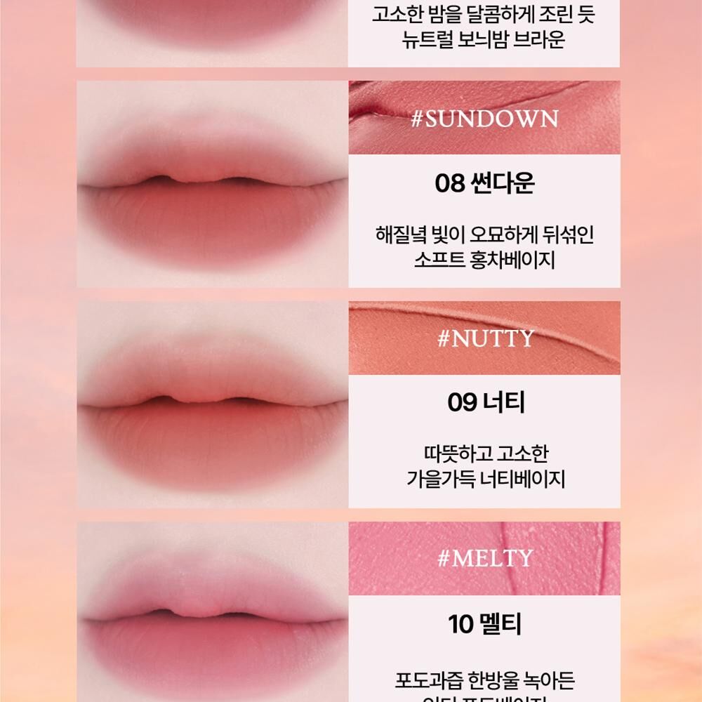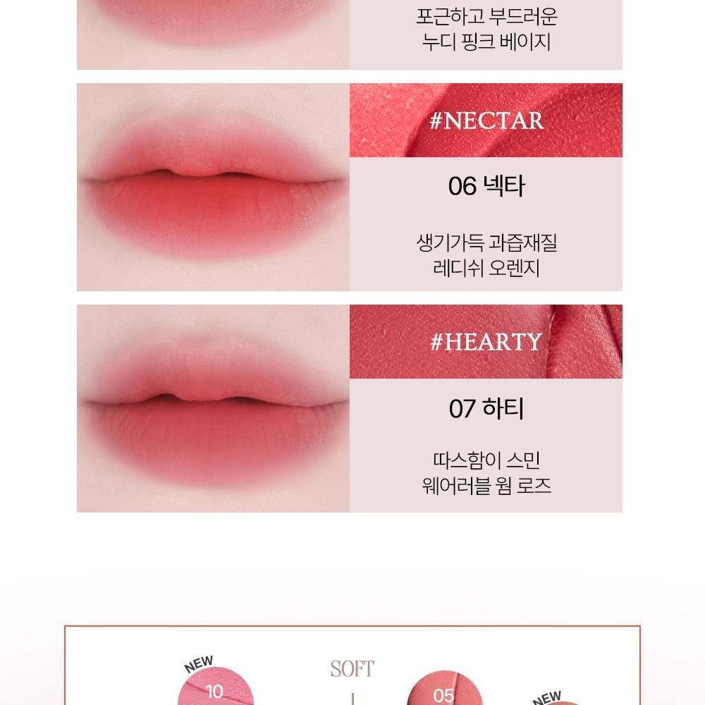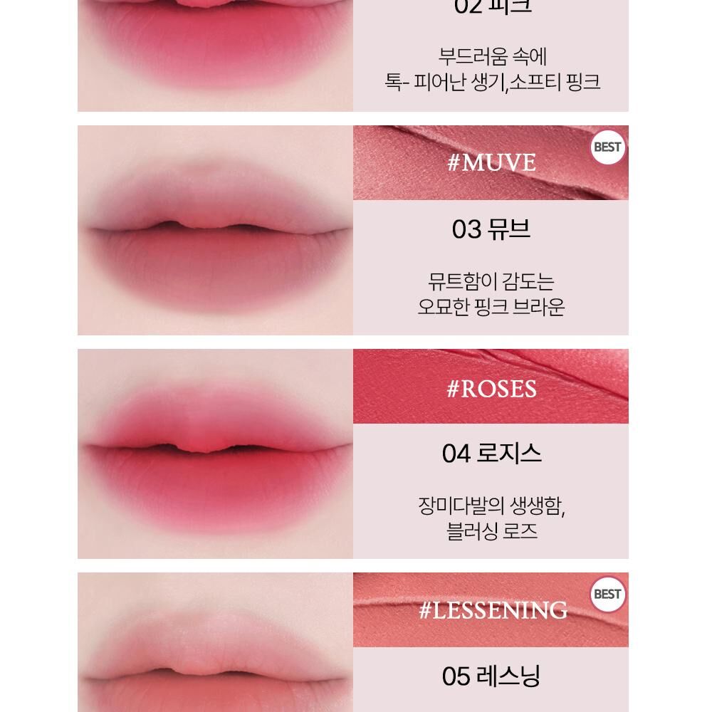 氛圍感色彩: 產品的色彩通常為柔和的啞光色調,適合打造韓系流行的氛圍感柔霧唇。