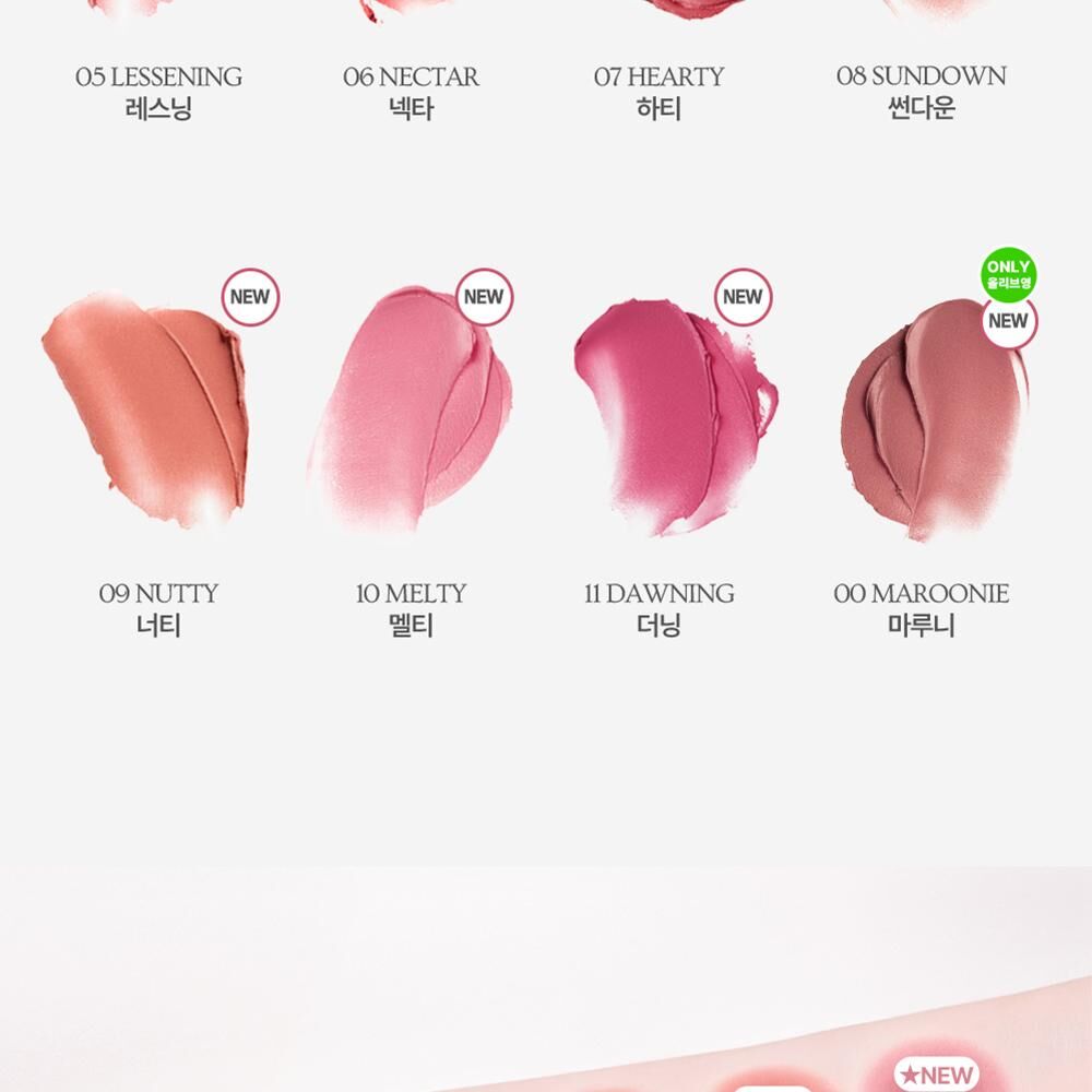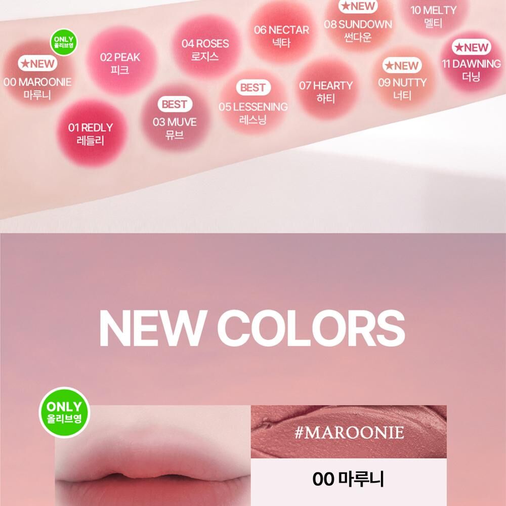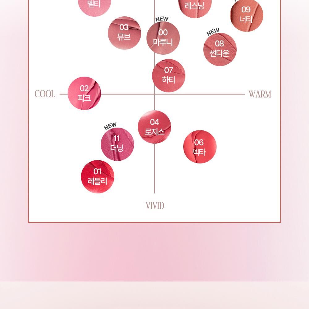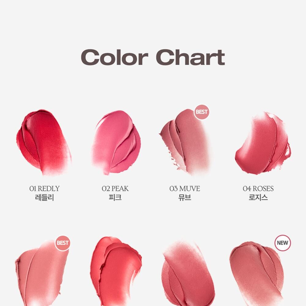 氛圍感色彩: 產品的色彩通常為柔和的啞光色調,適合打造韓系流行的氛圍感柔霧唇。
