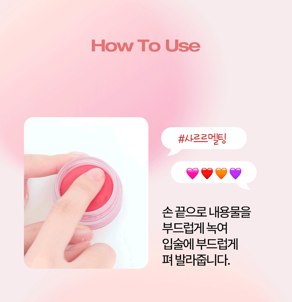 使用方法: 用指腹輕輕溫熱並沾取唇膏,然後均勻、柔滑地塗抹於唇部。可輕拍暈染唇線,以打造自然的柔焦效果。