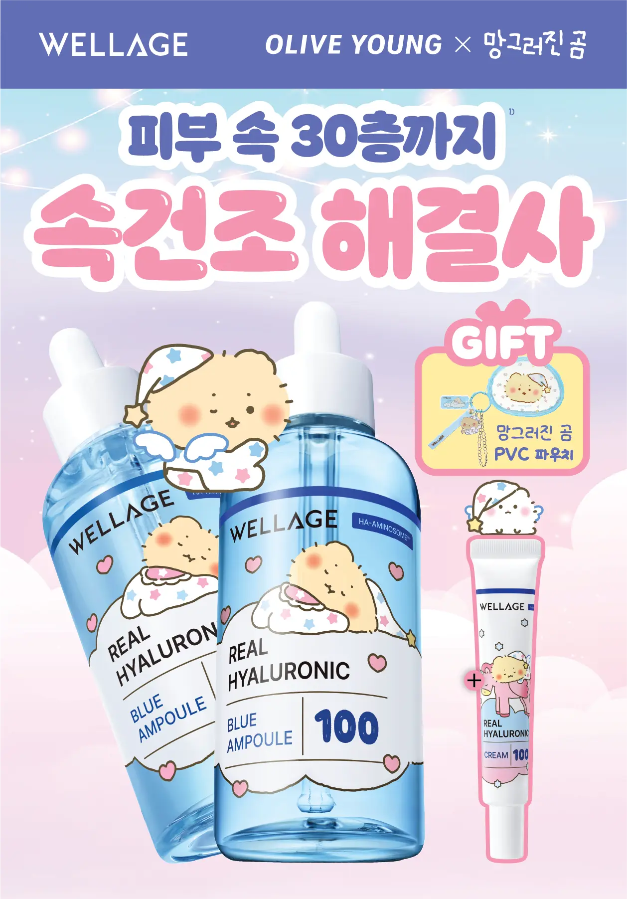 【mangomee 聯名限定版】WELLAGE 100 高純度玻尿酸保濕安瓶 75ml (1+1+保濕霜 20ml+收納包)