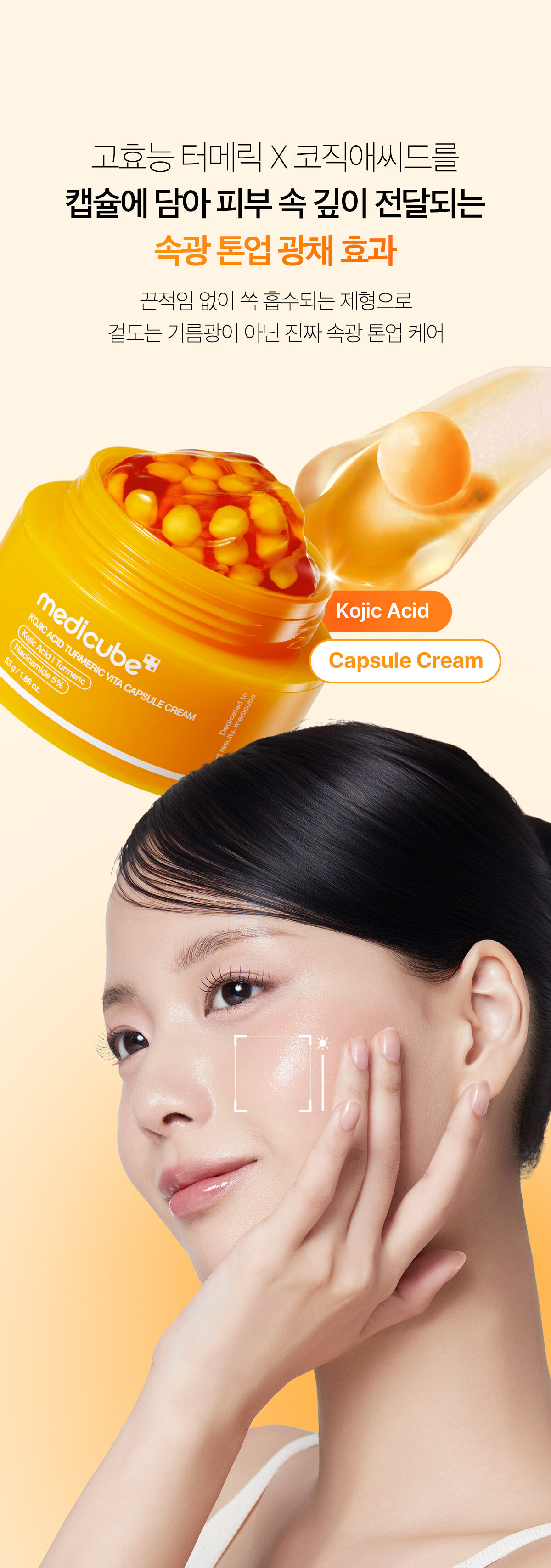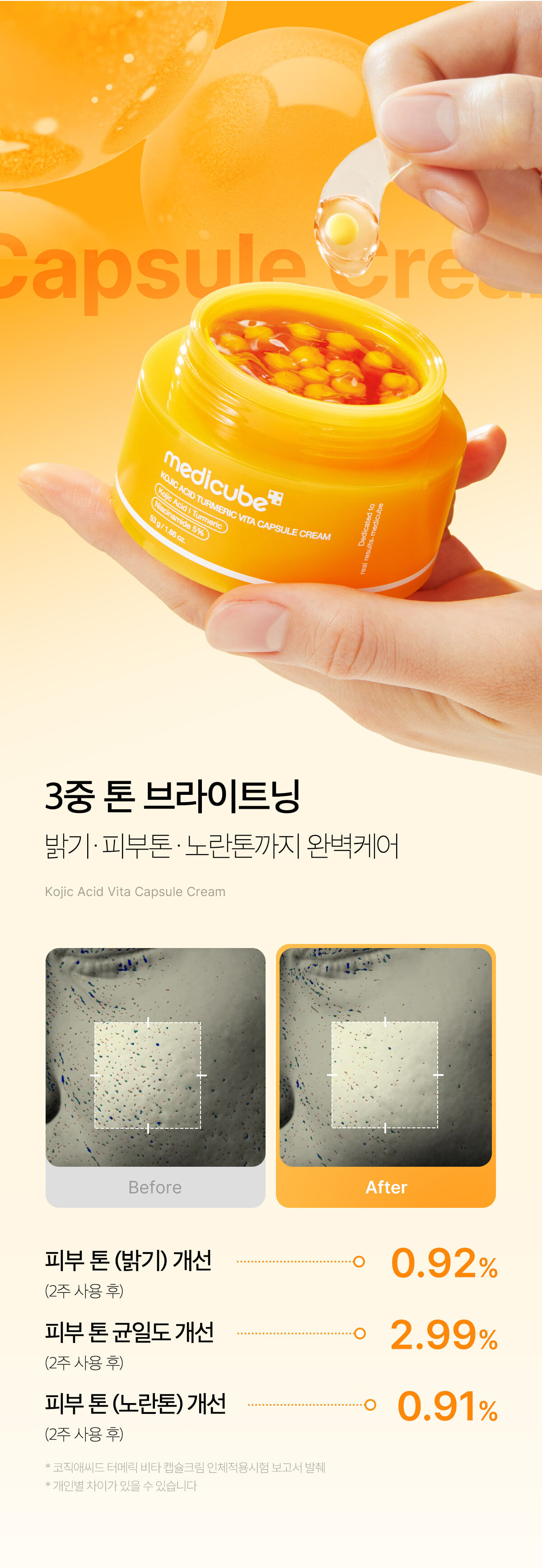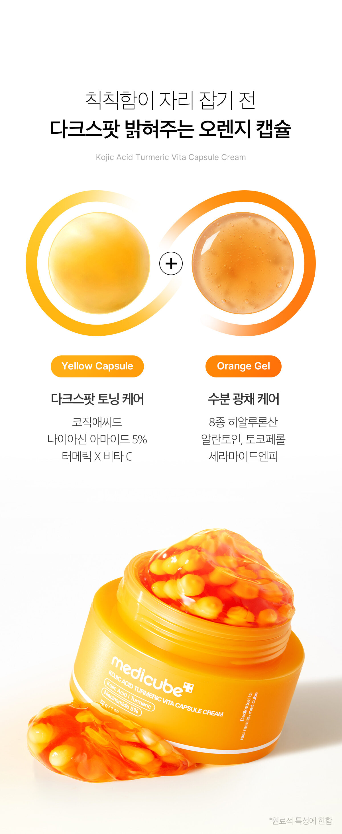 💊 維他命膠囊保鮮技術:將活性亮白成分封存於「淡黃色膠囊」中,搭配「橘色能量凝膠」,確保每次使用都是最新鮮的護膚能量。