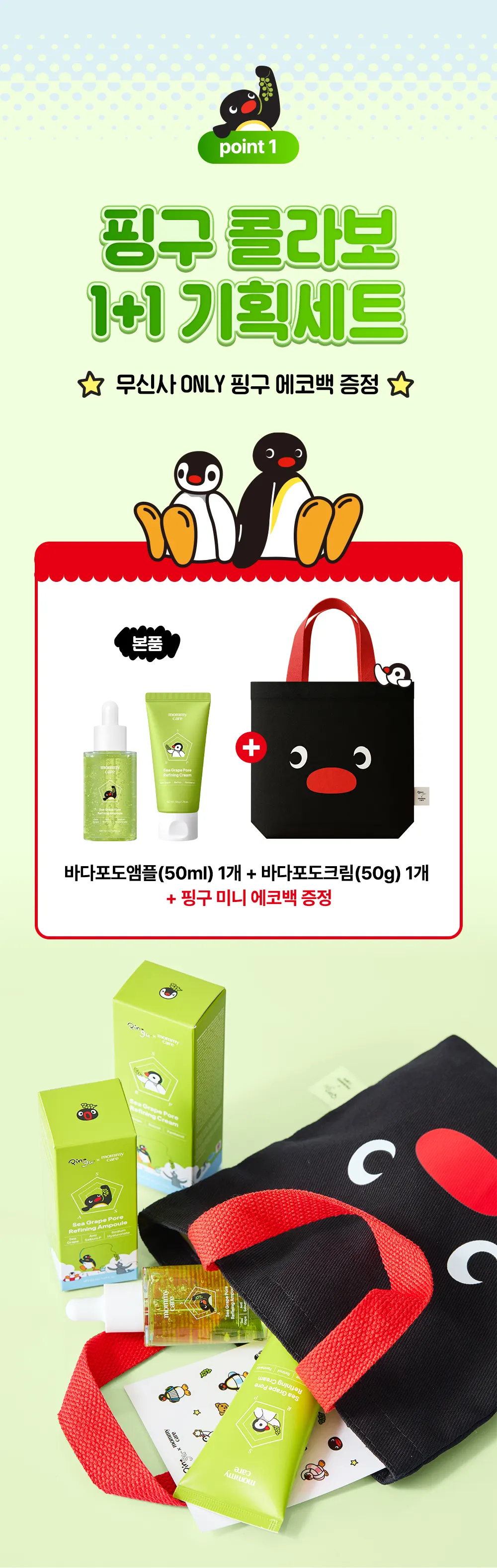 韓國國民保養品牌 MOMMY CARE 與經典動畫 《Pingu 企鵝家族》 的超強聯名再度出擊!這款限量套組專為海葡萄面霜的忠實粉絲設計,直接提供 2 入正裝面霜,讓妳在早晚保養中大方厚塗,徹底解決毛孔粗大與肌膚乾燥。更令人驚喜的是,隨組附贈 Pingu 限定帆布環保袋,讓可愛的 Pingu 陪伴妳每一天的護膚與生活時光。