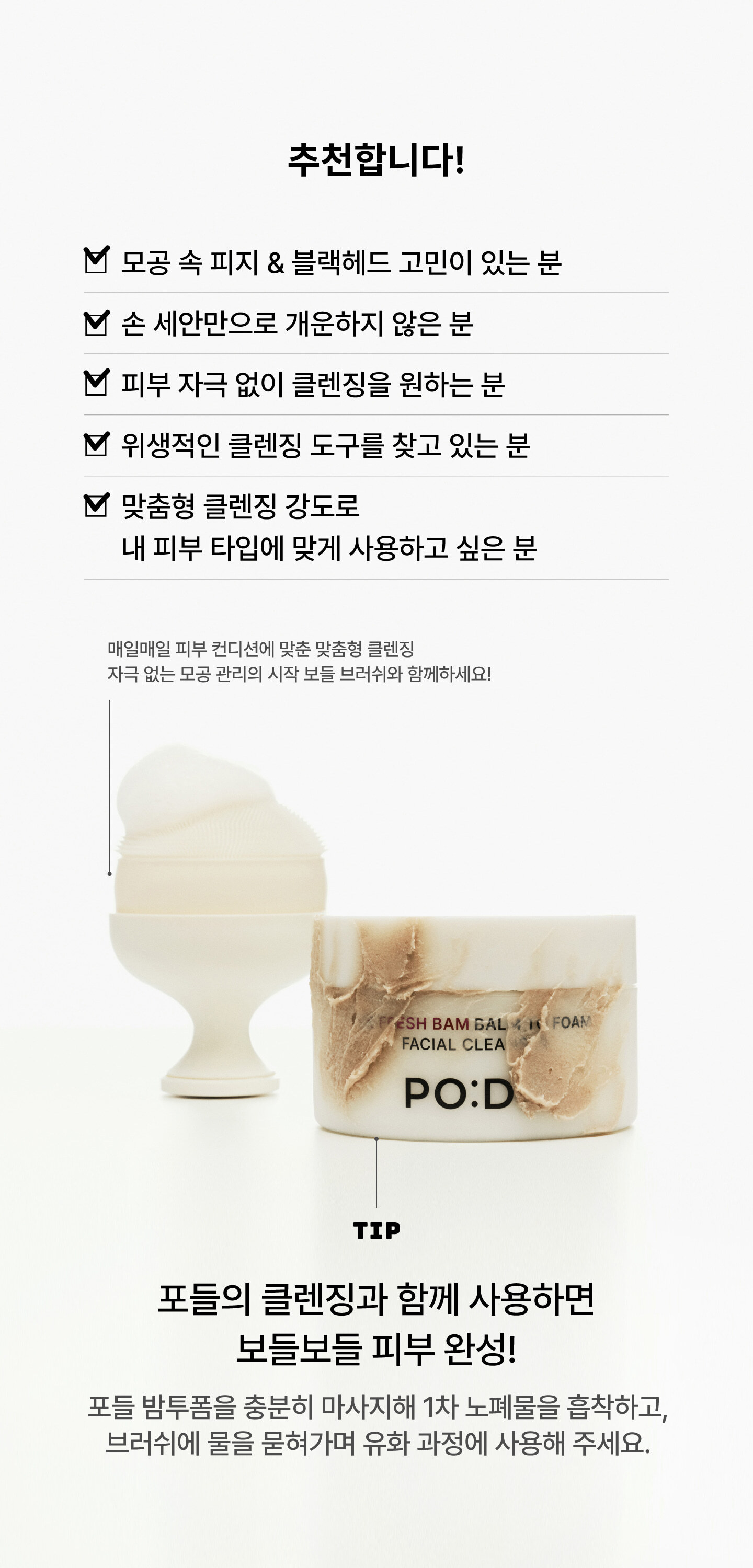 這是一款獲得韓國專利認證的深層清潔工具,專門為解決「毛孔深層皮脂」與「頑固黑頭」而設計。PO:DL 研發出比髮絲還要細緻的極細纖維刷毛,能深入手部無法觸及的毛孔縫隙,將堆積的氧化油脂、殘留彩妝與老廢角質「連根拔起」,讓肌膚恢復最純淨的呼吸狀態。