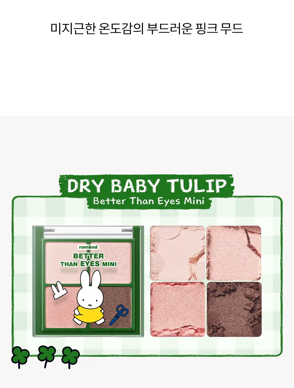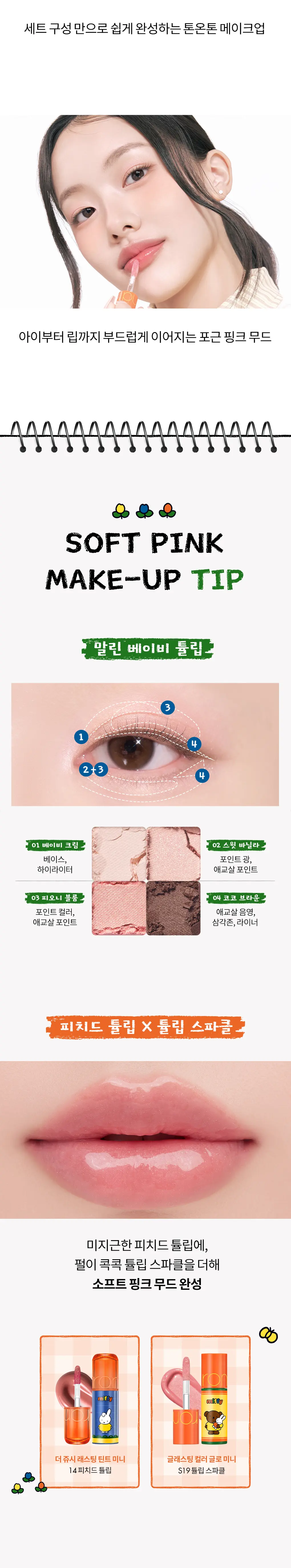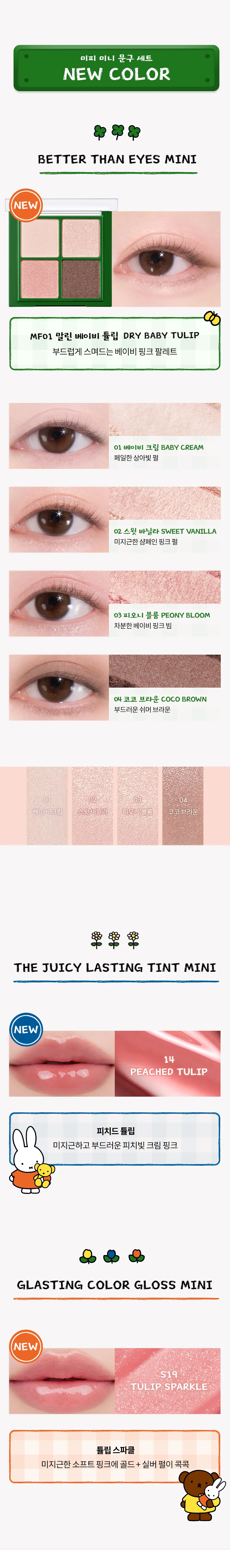 💖 粉嫩鬱金香色系:以經典「Dry Baby Tulip」為靈感,調配出初春感的桃粉與活力橘色調。包含迷你四色眼影與兩款不同質感的唇彩,輕鬆打造韓系溫柔、清澈的「鬱金香妝容」。