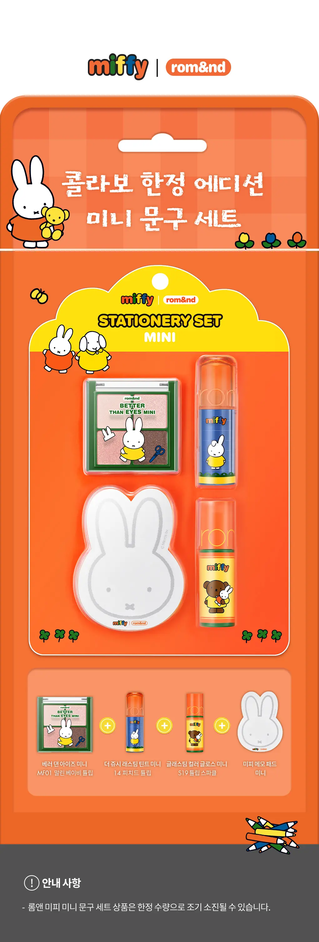 🐰 米飛兔文具風限定:ROMAND 與 Miffy 攜手打造最萌「文具盒」美妝組!將熱銷唇彩與眼影濃縮進迷你包裝,像色鉛筆般繽紛可愛。一組收齊底色、亮片與唇妝,讓化妝像在筆記本上塗鴉一樣療癒。