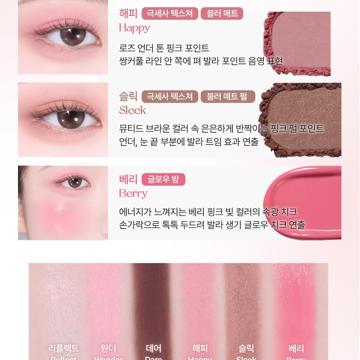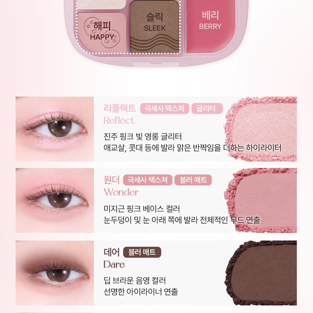 💖 多樣質地:柔霧、珠光、亮片、柔光膏,一盤搞定。