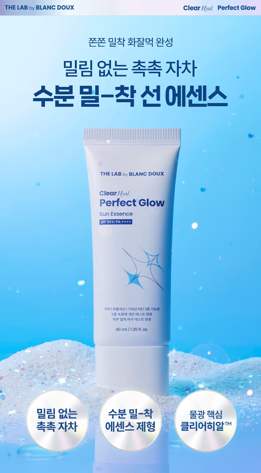 這是一款將「高效防曬」與「深度補水精華」完美融合的高階防護產品。THE LAB BY BLANC DOUX 針對傳統防曬容易乾澀、泛白或厚重的痛點,研發出這款質地如水般輕盈的防曬精華。它不僅具備最高等級的紫外線防護力,更搭載了品牌靈魂成分——低分子透明質酸,讓防曬步驟變成肌膚的「第二次灌溉」,打造出如同韓劇女主角般清透、充滿露水光澤(Dewy Glow)的立體水光肌。