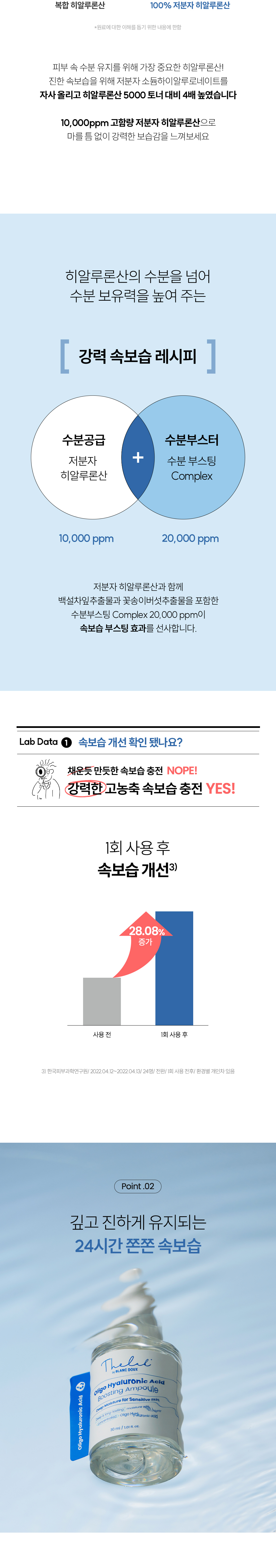 這是一款具備「爆水能量」的高濃度精華安瓶。THE LAB BY BLANC DOUX 為了應對極度乾燥與保養瓶頸期,研發出這款含有高達 10,000 ppm 微分子低分子透明質酸的強效配方。它不只提供表層補水,更透過甘油葡萄糖苷 (Glyceryl Glucoside) 開啟肌膚的水分通道(水通道蛋白),將高濃度的保濕因子精準輸送至肌底,讓肌膚由內而外呈現出極致的澎潤與彈力感。