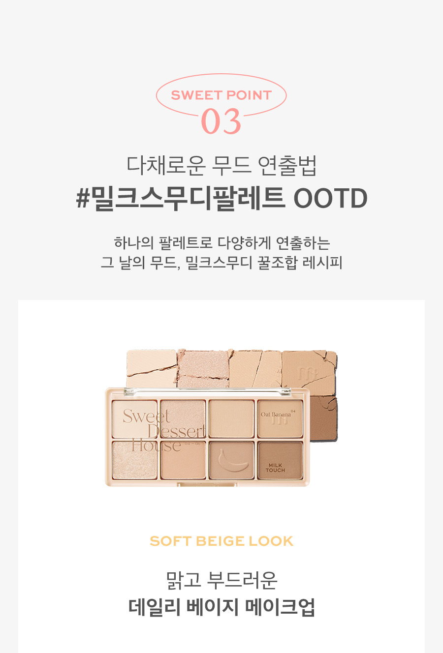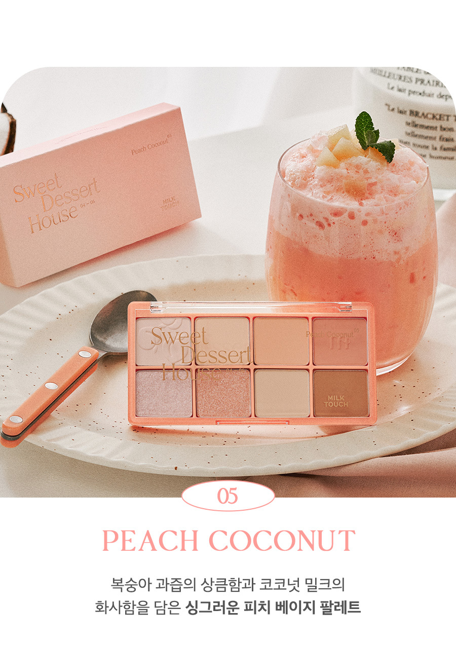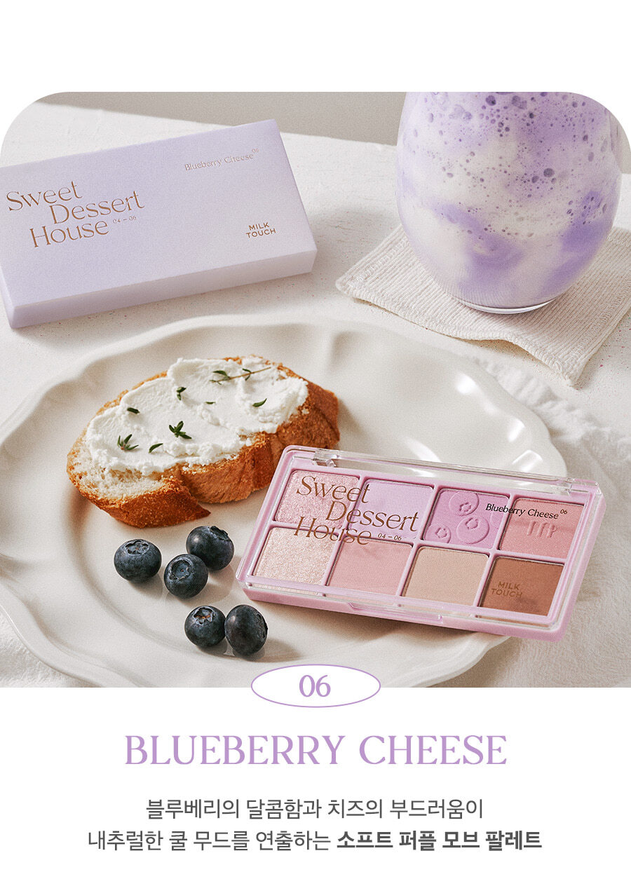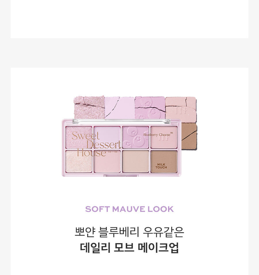 這款 Be My Sweet Dessert House Palette (#Milk Smoothie) 是 Milk Touch 專為追求「極致純淨感」而研發的冷調/中性調眼影盤。#Milk Smoothie (牛奶奶昔) 色號採用了時下最流行的低飽和擴張色,透過輕盈的奶油色、柔和的灰粉色與淺棕色,能自然地深邃眼窩,同時修飾眼部暗沉,讓雙眼看起來清澈有神。
